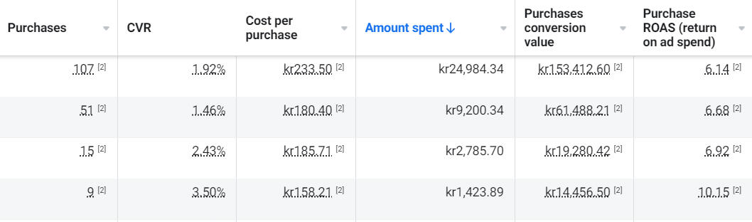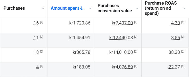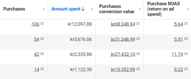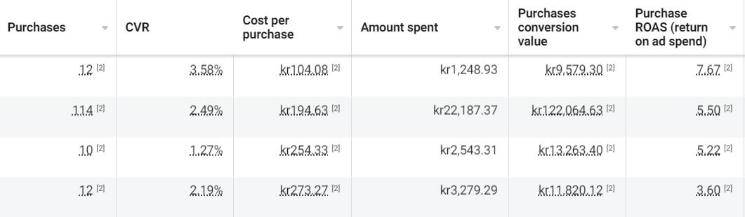 Purchases, ad spend, conversion value, ROAS